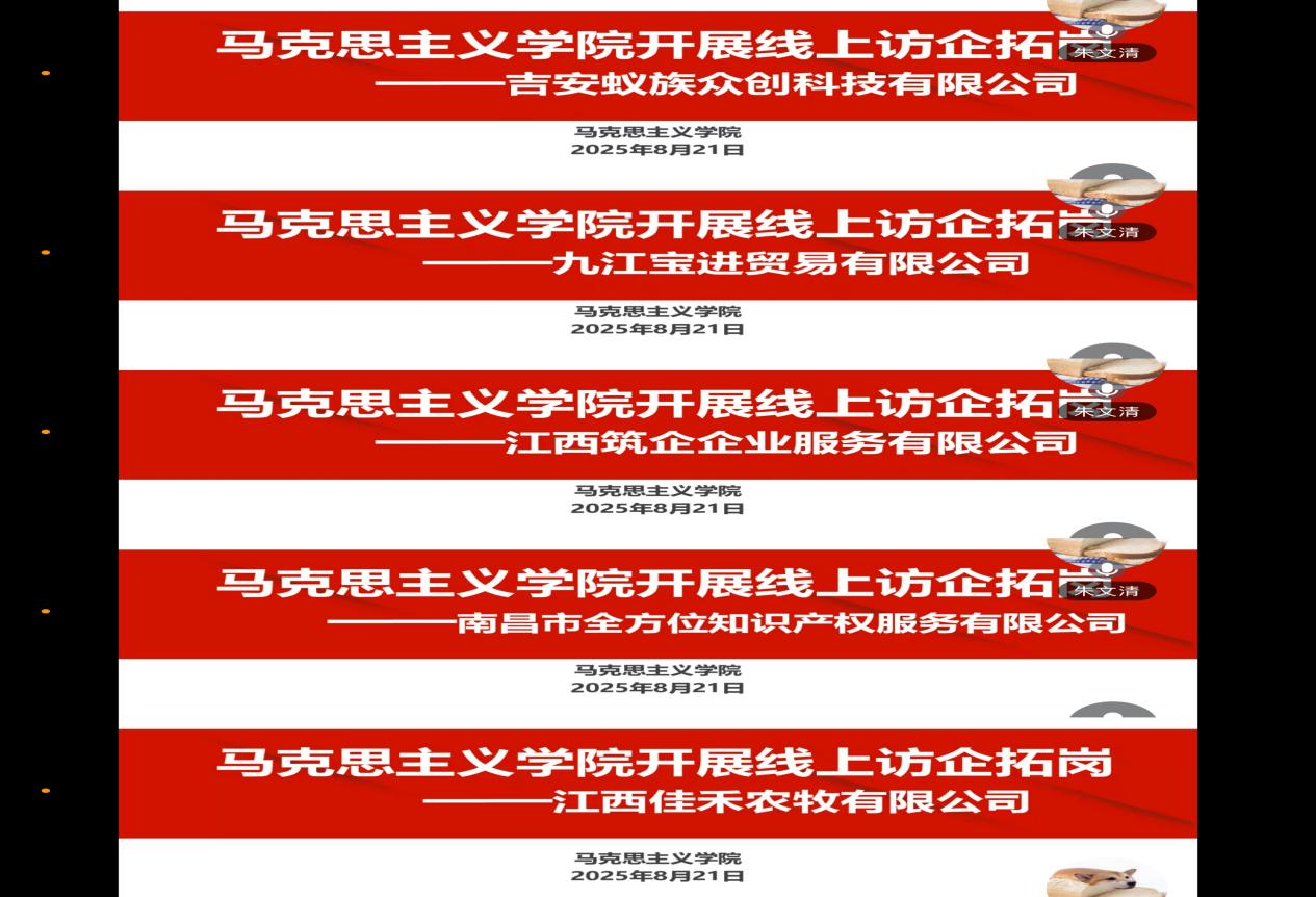 为进一步加强校企合作,拓宽毕业生就业渠道,提升人才培养质量,近日,304永利集团官网入口组织了一场线上访企拓岗专项活动,304永利集团官网入口党总支书记张欣康通过视频会议的形式访问了吉安蚁族众创科技有限公司、九江宝进贸易有限公司、江西筑企企业服务有限公司、南昌市全方位知识产权服务有限公司、江西佳禾农牧有限公司。此次活动旨在深入了解企业需求,探索校企合作新模式,共同促进毕业生高质量就业。
