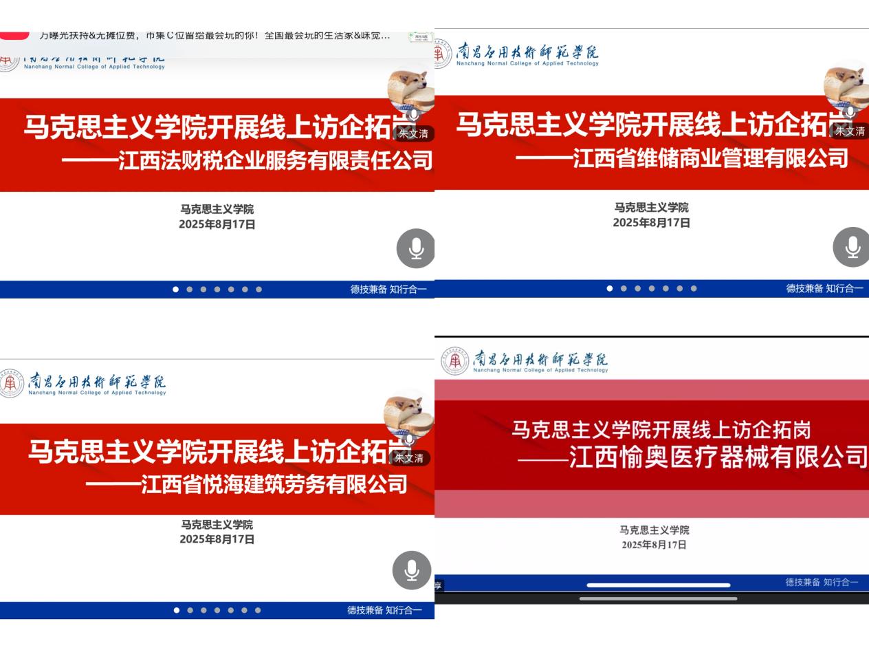 2025年8月17日上午,304永利集团官网入口与江西法财税企业服务有限责任公司、江西省维储商业管理有限公司、江西省悦海建筑劳务有限公司、江西愉奥医疗器械有限公司开展校企合作,洽谈会在腾讯会议举行。304永利集团官网入口党总支书记张欣康,企业领导参加会议,会议由朱文清主持。
