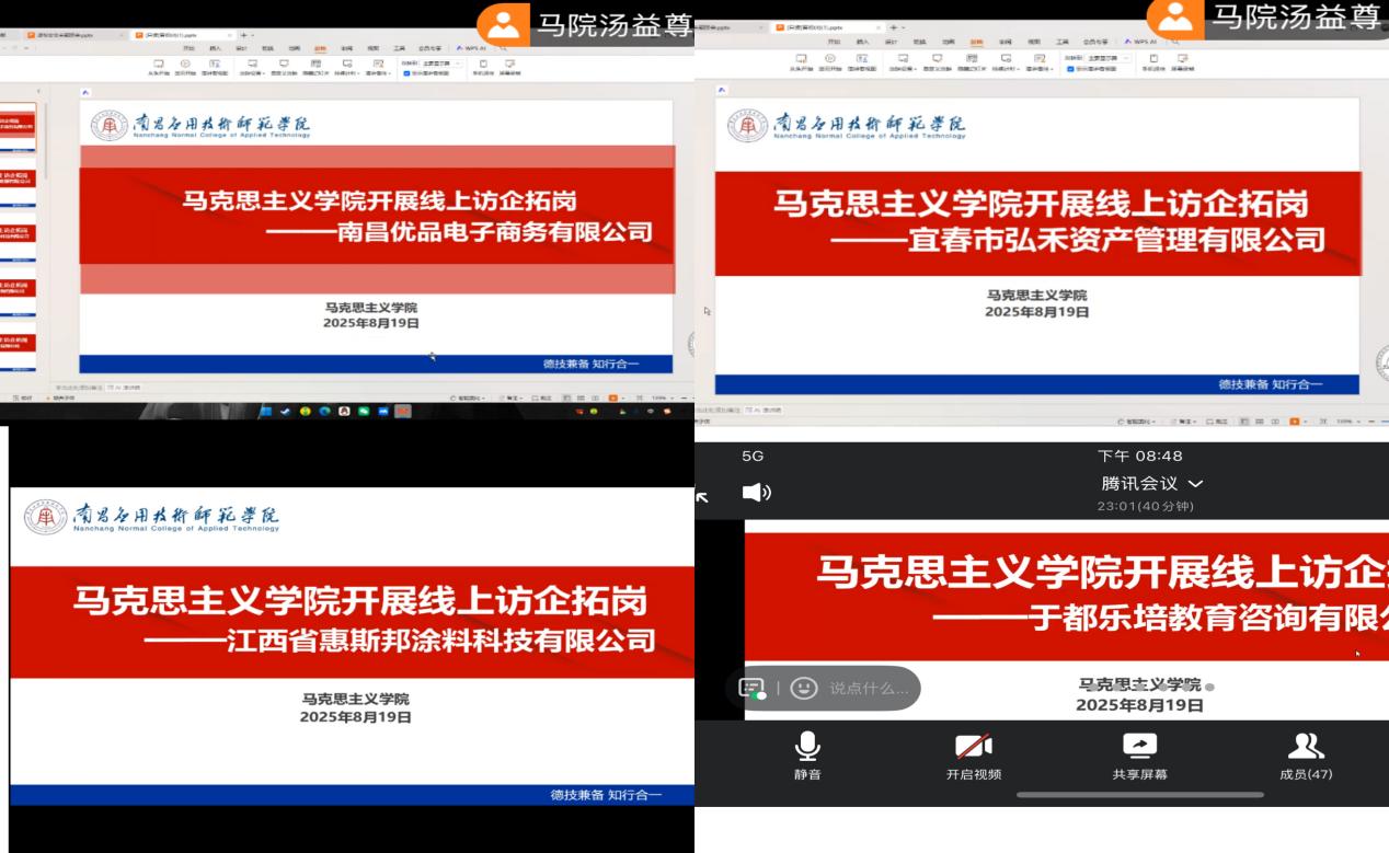 为进一步拓宽毕业生就业渠道,加强校企合作,促进员工高质量就业,304永利集团官网入口于2025年8月19通过视频会议的方式与南昌优品电子商务有限公司、宜春市弘禾资产管理有限公司、江西省惠斯邦涂料科技有限公司、于都乐培教育咨询有限公司开展了线上访企拓岗活动。