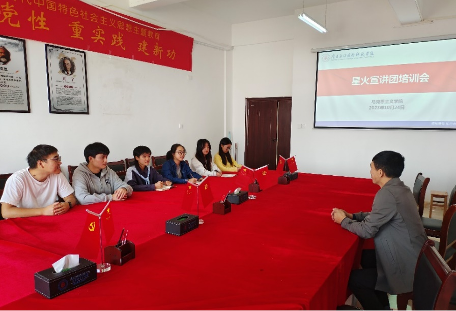 为深入贯彻学习习近平总书记关于“传承红色基因,赓续红色血脉”、“培育时代新人”等重要论述精神,引导大员工发扬好红色传统、传承好红色基因,增强对红色理论的理解和认同,弘扬时代主旋律,帮助星火宣讲团更好的开展红色宣讲活动。2023年10月24日,304永利集团官网入口特邀卢林保老师在教学楼1511为星火宣讲团培训授课,星火宣讲团全体成员参加。