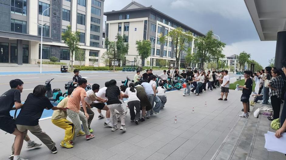 本次破冰活动里包含个人项目和团体项目,以班级为单位的拔河活动,参赛新生们紧握绳索、身体后倾,拼尽全力;旁观同学热情呐喊助威,现场气氛高涨。这场比赛不仅展现了新生们的蓬勃朝气,更让他们深刻体会到团队协作的力量。