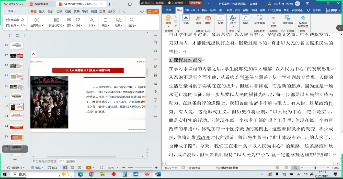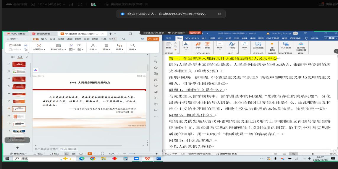 首先,会议进行示范课教学分享。黄婉凌老师围绕“为什么必须坚持以人民为中心”专题进行教学设计,课程导入环节,黄老师以爱德曼信任度晴雨表数据为切入点,构建了“为何坚持—为了人民”、“依靠谁—依靠人民”、“由谁评判—评判由人民”的三大理论框架,逻辑严谨,层层递进。在教学方法上,课程有机融入了“携手为人民”短视频、《人民的名义》剧集案例等多媒体素材,实现了理论讲授与情感共鸣的有机结合,获得了与会员工的高度认可,被认为是一堂具有强逻辑性与感染力的高质量示范课。