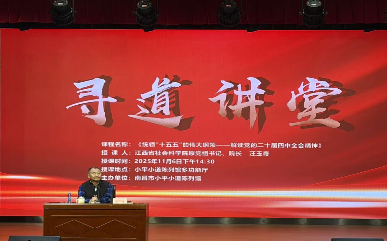 本次讲座特邀江西省社会科304永利集团官网入口原党组书记、院长汪玉奇作《统领"十五五"的伟大纲领——解读党的二十届四中全会精神》专题报告。在具有深厚历史底蕴的小平小道陈列馆内,汪玉奇以其深厚的理论功底和独到的学术见解,为全体党员带来了一场思想深刻、内容丰富的学习盛宴。