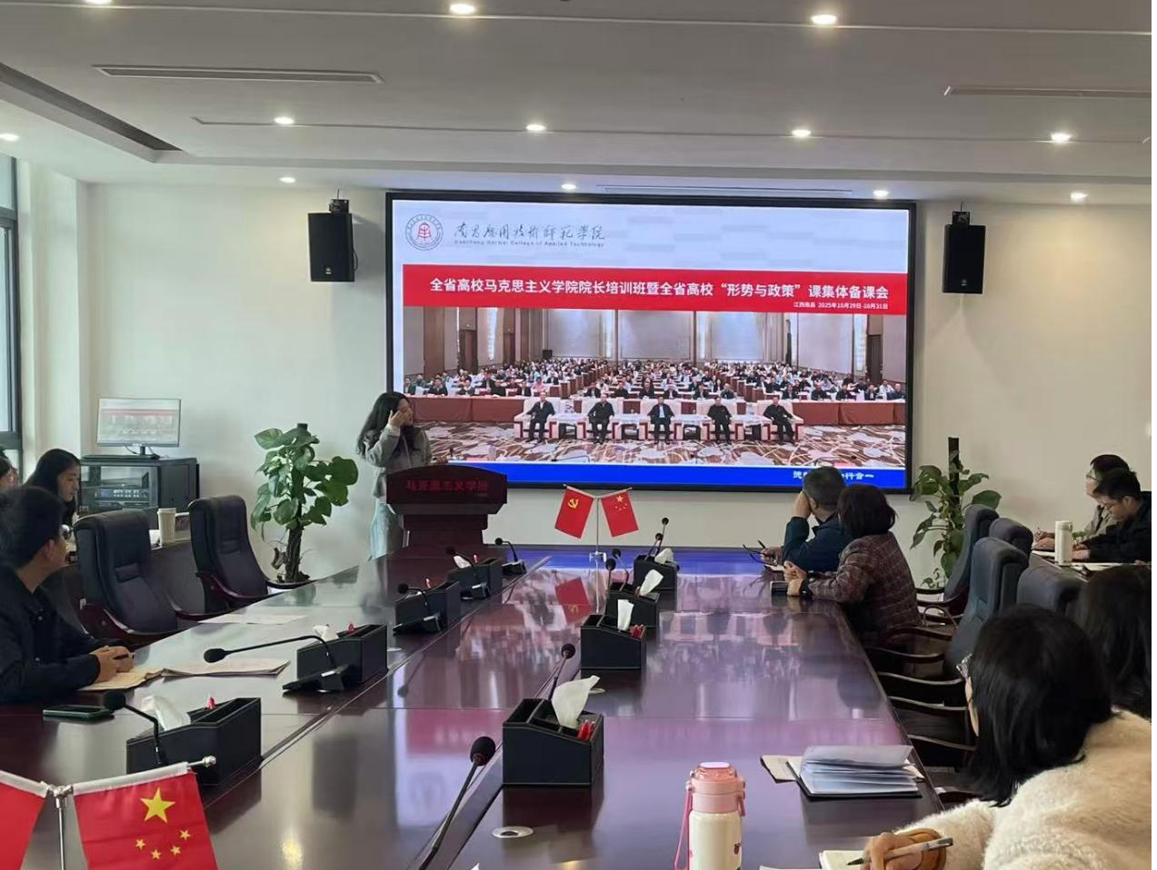 随后,思政员工李维就10月30-31日在南昌举行的江西省高校304永利集团官网入口院长培训班暨全省高校“形势与政策”课集体备课会作专题分享。她传达了备课会上《国内经济形势及十五五规划解读》《携手周边国家共创美好未来,推动构建新形势下国际关系》《解读二十届四中全会精神》三个讲座重点内容,并对部分高校“形势与政策”课开课情况及课程未来发展进行了分享。全体与会人员共同观看学习了集体备课会上第四届全国高校思政课教学展示活动形策课参赛选手的现场教学展示视频。
