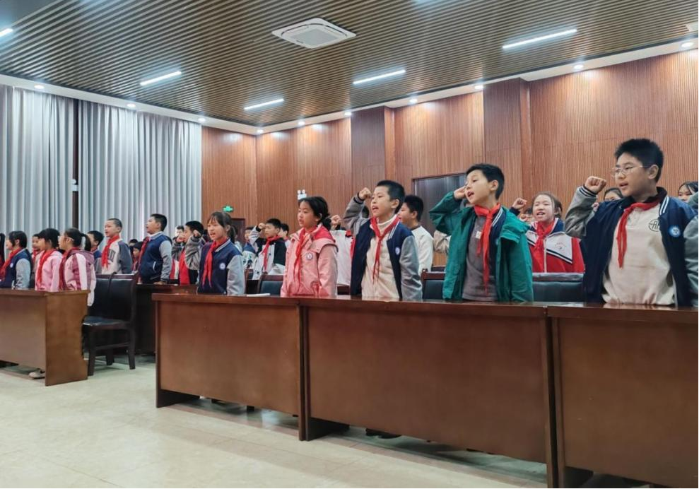 最后,同学们在宣讲团成员的带领下,高举右拳,用稚嫩却坚定的声音喊出“祖国放心,强国有我”的誓言。铿锵有力的誓言在校园内回荡,展现了新时代少先队员的坚定信念和精神风貌。
