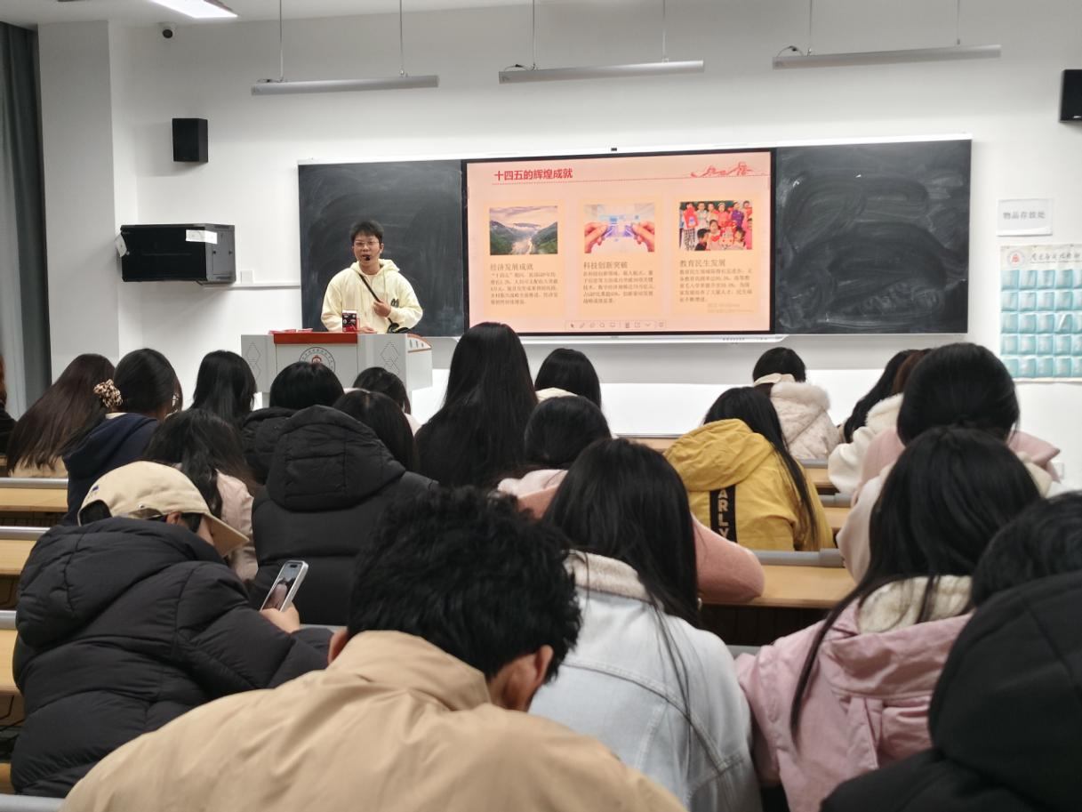 活动伊始,宣讲团成员王毅以系统导学开篇,围绕党的二十届四中全会召开的时代背景与战略意义展开深度解读,全面梳理会议核心要义与部署要求。他结合"十四五"时期国家发展取得的重大成就,立足中国式现代化建设全局,清晰阐释推进国家治理体系和治理能力现代化的历史必然,帮助在场学子深化对党中央决策部署的政治认同、思想认同与情感认同,切实感悟"国之大者"的深刻内涵。