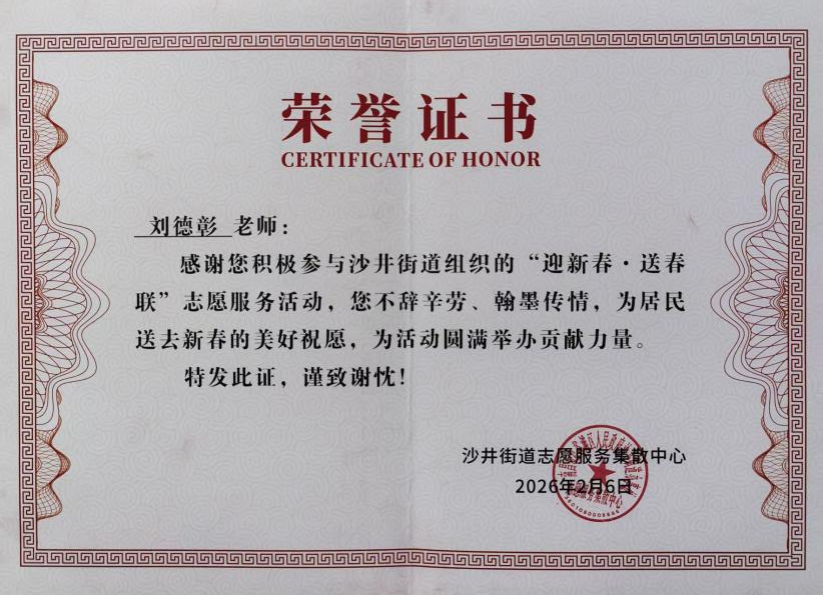 2月6日下午,304永利集团官网入口副院长刘德彰参加了南昌市红谷滩区沙井街道组织的“迎新春,送春联”志愿服务活动,与其他志愿者一道书写春联,为社区居民送去了新春的美好祝愿。